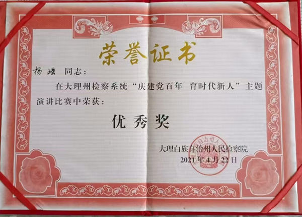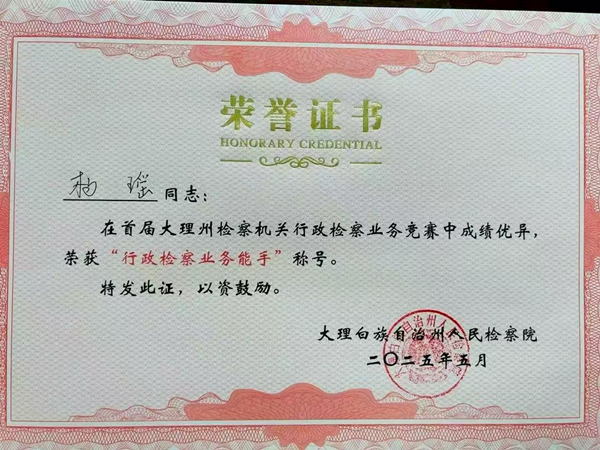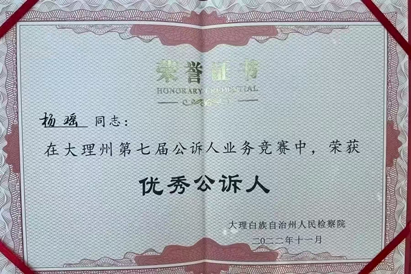 杨瑶同志自参加工作以来,时时刻刻按照共产党员和检察官的标准严格要求自己,始终恪尽职守、勇于担当、勤奋工作。工作中,她严格服从院党组和院领导的安排,顾全大局、积极工作,从不计较个人得失,良好的职业道德操守和工作业绩得到单位领导和同事的充分肯定。杨瑶同志在做好本职工作的同时,注重综合能力的全面锻炼,她积极参加各级各部门举办的演讲比赛、辩论赛、检察业务竞赛并多次获奖。2021年参加大理州人民检察院“庆建党百年 育时代新人”主题演讲比赛获优秀奖。2022年参加全州公诉人大赛,荣获“优秀公诉人”称号;2024年度荣获漾濞县首届“先进工作者”称号;2025年参加大理州行政检察业务竞赛,荣获“行政检察业务能手”称号。先后6次被院党组表彰为“先进工作者”“先进个人”“优秀共产党员”。